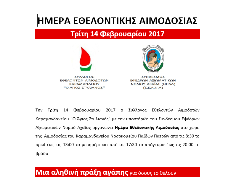 Την Τρίτη 14 Φεβρουαρίου 2017 ο Σύλλογος Εθελοντών Αιμοδοτών Καραμανδανείου “Ο Άγιος